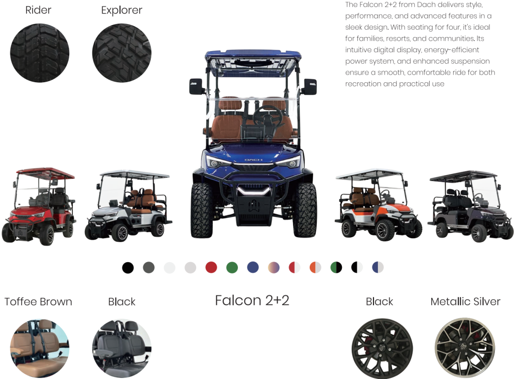The Dach Falcon 2+2 gives owners plenty of visual and style customisation to make the vehicle uniquely theirs. You can choose from multiple exterior colour options such as Grey, Red, White, Black, Blue and Chameleon to suit your personal taste. The interior also offers seat colour choices to complement your look, and this can be matched with bespoke styling throughout the cabin. On the wheels and tyres front, the Apollo typically comes with stylish 14″ alloy wheels and you can select between street or all-terrain tyre options to tailor performance and aesthetics to how and where you’ll be driving. Additionally, there are mag (wheel) design choices that add further individuality and flair to the vehicle’s overall appearance..